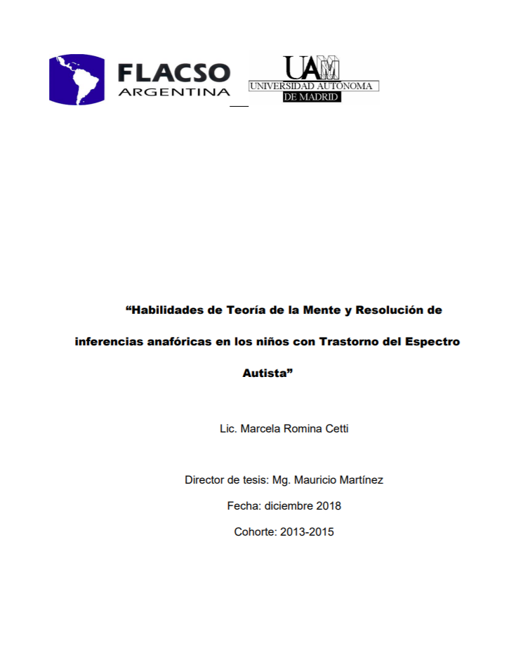 Cetti, Marcela Romina. (2018). Habilidades de teoría de la mente y resolución de inferencias anafóricas en los niños con trastorno del espectro autista. Tesis de Maestría. FLACSO. Sede Académica Argentina, Buenos Aires.
