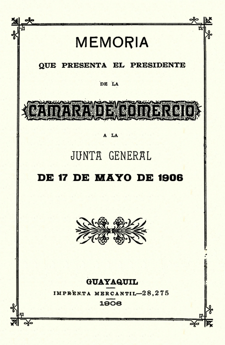 Cámara de Comercio de Guayaquil. 1906. Memoria que presenta el presidente de la Cámara de Comercio a la Junta General de 17 de mayo de 1906. Guayaquil, Ecuador : Imprenta Mercantil.