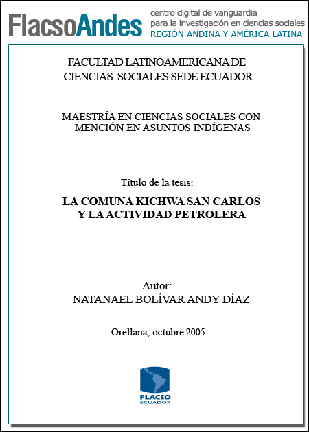 Andy Díaz, Natanael Bolívar (2005). La comuna Kichwa San Carlos y la actividad petrolera. Maestría en Ciencias Sociales con mención en Asuntos Indígenas; FLACSO - Sede Ecuador. Quito. 73p.