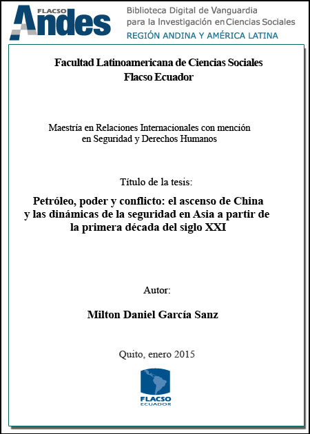 García Sanz, Miltón Daniel. 2015. Petróleo, poder y conflicto: el ascenso de China y las dinámicas de la seguridad en Asia a partir de la primera década del siglo XXI. Tesis de maestría, Flacso Ecuador.