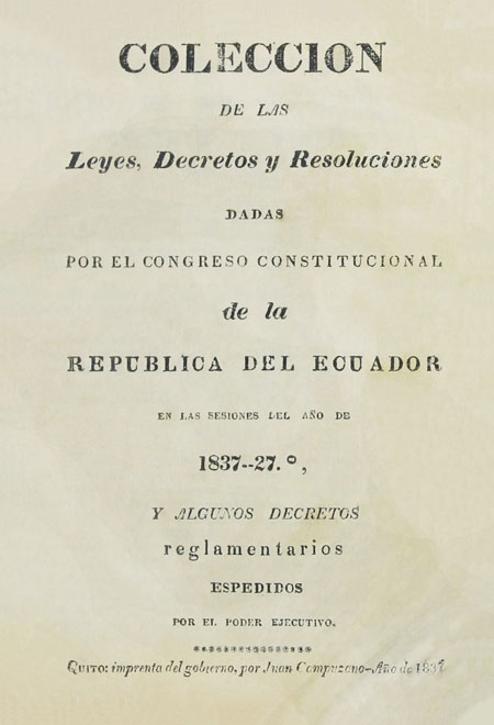 1837. Colección de las Leyes, Decretos y Resoluciones dadas por el Congreso Constitucional de la República del Ecuador en las sesiones del año de 1837-27 y algunos decretos reglamentarios espedidos por el poder ejecutivo. Quito, Ecuador : Imprenta del Gobierno, por Juan Campuzano.
