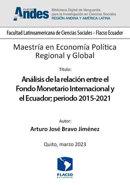 Bravo Jiménez, Arturo José. 2023. Análisis de la relación entre el Fondo Monetario Internacional y el Ecuador; periodo 2015-2021. Tesis de maestría, Flacso Ecuador.