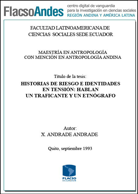 Andrade Andrade, Xavier (1993). Historias de riesgo e identidades en tensión: hablan un traficante y un etnógrafo. Maestría en Antropología con Mención en Antropología Andina, FLACSO Sede Ecuador. Quito. 86 p.