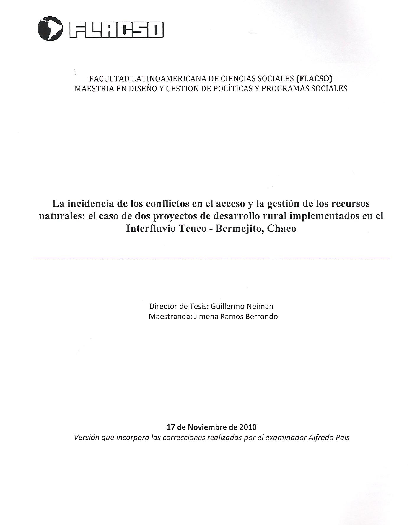 Ramos Berrondo, Jimena (2010). La incidencia de los conflictos en el acceso y la gestión de los recursos naturales : el caso de dos proyectos de desarrollo rural implementados en el interfluvio Teuco - Bermejito, Chaco. Tesis de Maestría. FLACSO. Sede Académica Argentina, Buenos Aires.