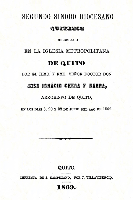 Barba, José Ignacio. 1869. Segundo Sínodo Diocesano Quitense celebrado en la Iglesia Metropolitana de Quito. Quito, Ecuador : Imprenta de J. Campuzano.