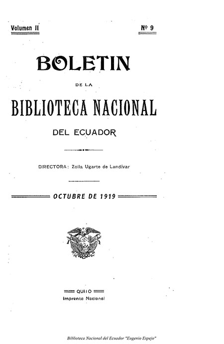 Ugarte de Landívar, Zoila. 1919. Boletín de la Biblioteca Nacional del Ecuador. V1. N9. Quito. Imprenta Nacional. 137 p.