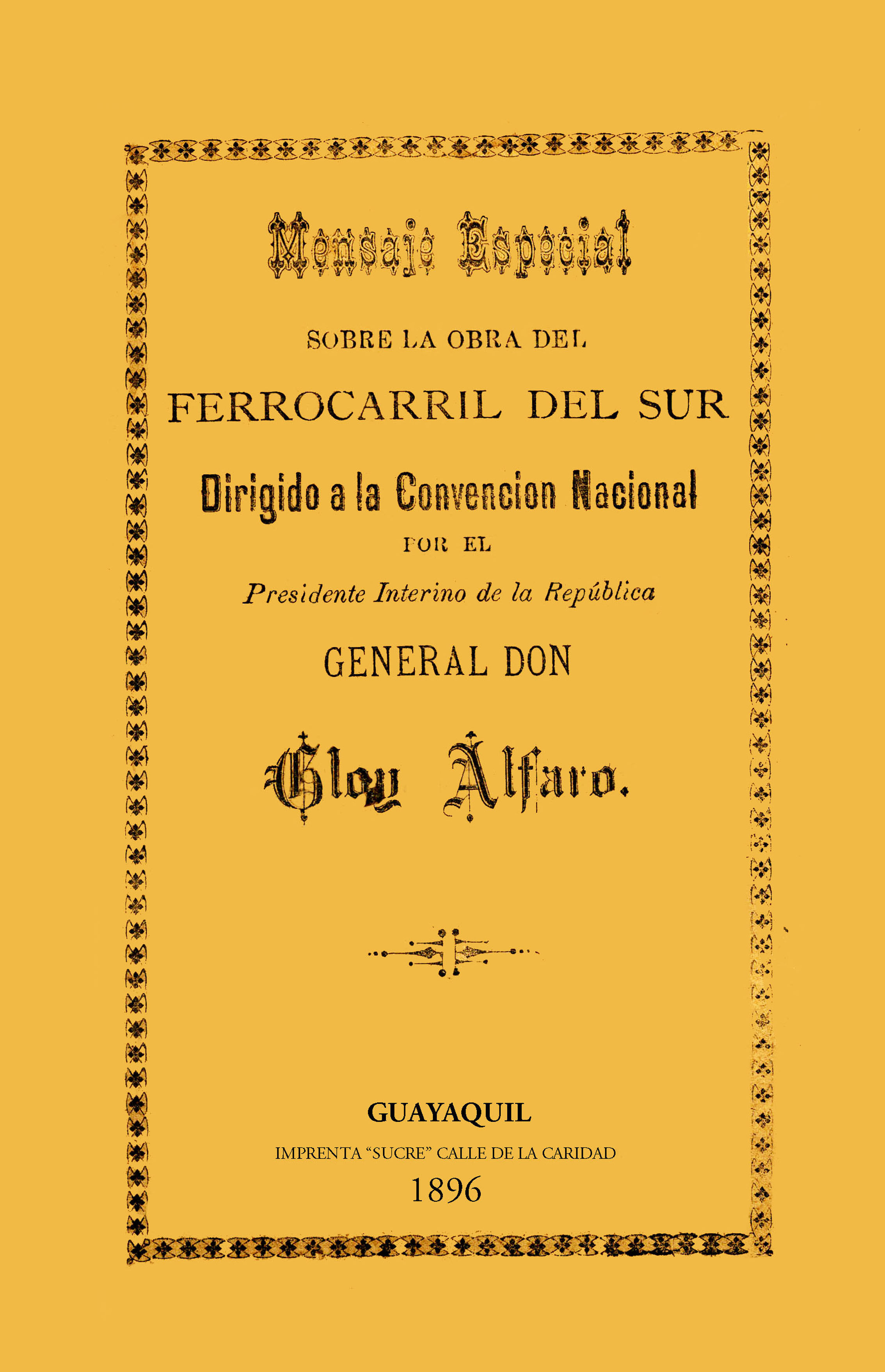 Alfaro, Eloy. 1896. Mensaje especial sobre la obra del Ferrocarril del Sur: dirigido a la Convención Nacional por el Presidente Interino de la República Generla Don Eloy Alfaro. Guayaquil, Ecuador : Imprenta "Sucre".