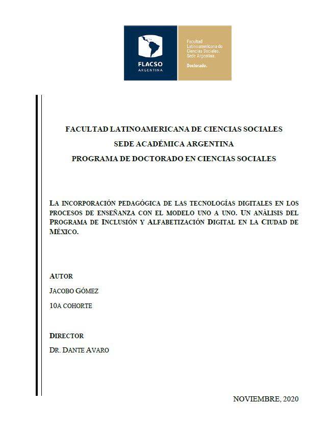 Gómez Quiroz, José Jacobo. (2020). La incorporación pedagógica de las tecnologías digitales en los procesos de enseñanza con el modelo uno a uno : un análisis del Programa de Inclusión y Alfabetización Digital en la Ciudad de México. Tesis de Doctorado. FLACSO. Sede Académica Argentina, Buenos Aires.