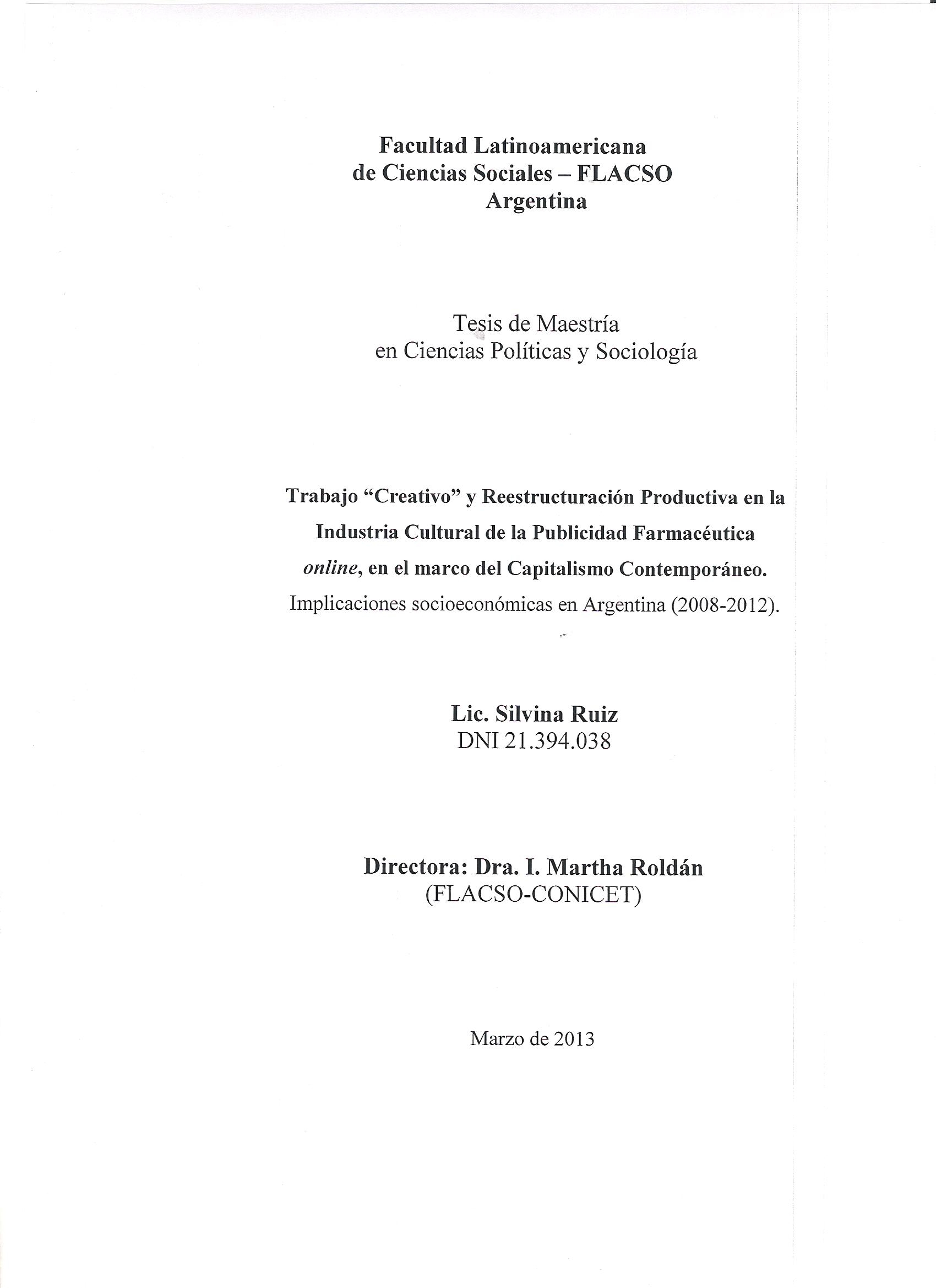 Ruiz, Silvina (2013). Trabajo creativo y reestructuración productiva en la industria cultural de la publicidad farmacéutica online en el marco del capitalismo contemporáneo : implicaciones socioeconómicas en Argentina, 2008 - 2012. Tesis de Maestría. FLACSO. Sede Académica Argentina, Buenos Aires.