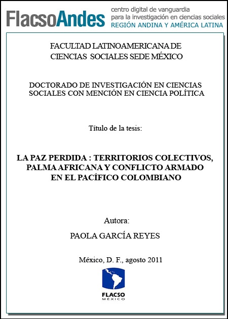 García Reyes, Paola (2011). La paz perdida : territorios colectivos, palma africana y conflicto armado en el Pacífico colombiano. Doctorado de Investigación en Ciencias Sociales con Mención en Ciencia Política; FLACSO México. México. 299 p.