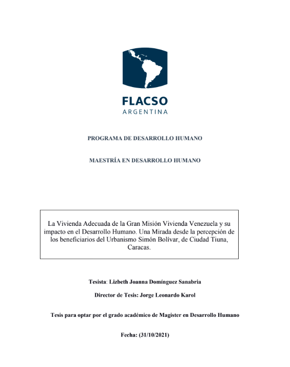 Domínguez Sanabria, Lizbeth Joanna (2021). La vivienda adecuada de la Gran Misión Vivienda Venezuela y su impacto en el desarrollo humano : una mirada desde la percepción de los beneficiarios del Urbanismo Simón Bolívar, de Ciudad Tiuna, Caracas. Tesis de Maestría. FLACSO. Sede Académica Argentina, Buenos Aires.