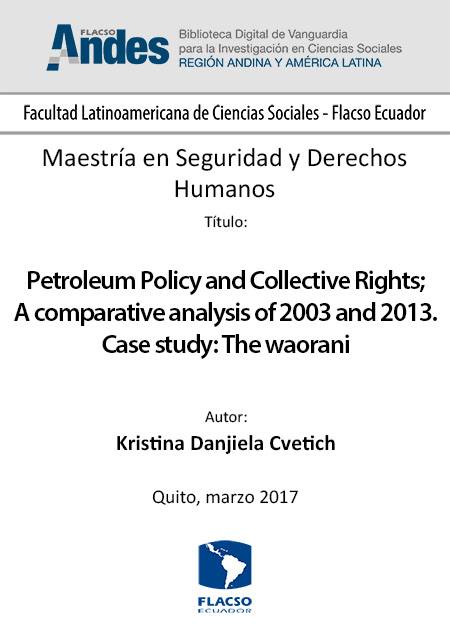 Danjiela Cvetich, Kristina. 2017. Petroleum Policy and Collective Rights; A comparative analysis of 2003 and 2013. Case study: The waorani. Tesis de maestría, Flacso Ecuador.