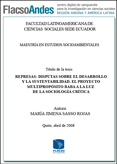 Sasso Rojas, María Jimena (2008). Represas: disputas sobre el desarrollo y la sustentabilidad. El Proyecto Multipropósito Baba a la luz de la sociología de la crítica. Programa de Estudios Socioambientales, FLACSO Sede Ecuador. Quito. 138 p.