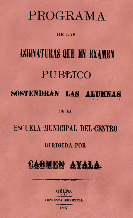 Ayala, Carmen. 1897. Programa de las asignaturas que en examen público sostendrán las alumnas de la Escuela Municipal del centro. Quito, Ecuador : Imprenta Municipal.