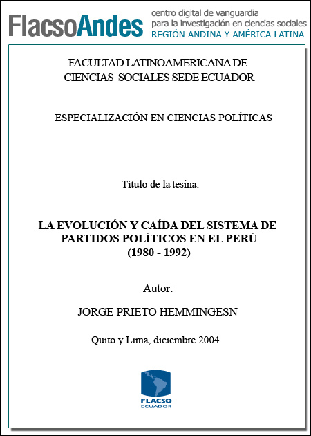 Prieto Hemmingsen, Jorge (2004). La evolución y la caída del sistema de partidos políticos en el Perú (1980-1992). Especialización en Ciencias Políticas; FLACSO sede Ecuador. Quito : Lima. 75 p.