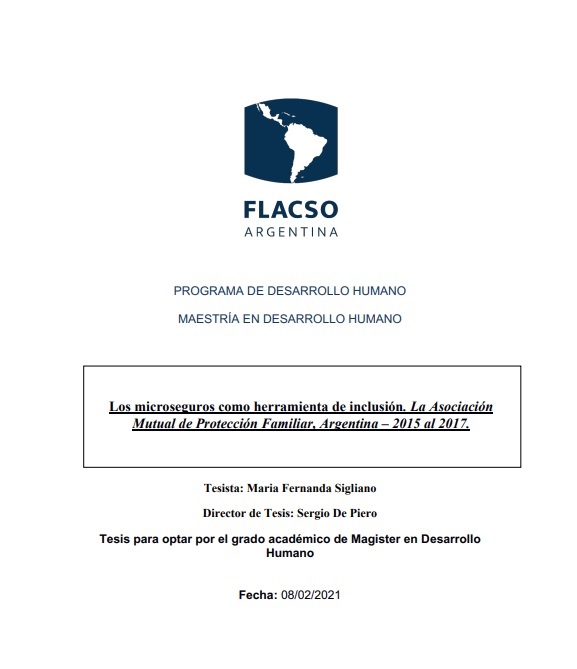 Sigliano, Maria Fernanda. (2021). Los microseguros como herramienta de inclusión : la Asociación Mutual de Protección Familiar, Argentina – 2015 al 2017. Tesis de Maestría. FLACSO. Sede Académica Argentina, Buenos Aires.