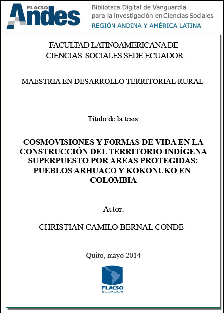 Bernal Conde, Christian Camilo. 2014. Cosmovisiones y formas de vida en la construcción del territorio indígena superpuesto por áreas protegidas: Pueblos Arhuaco y Kokonuko en Colombia. Tesis de maestría, FLACSO Sede Ecuador.