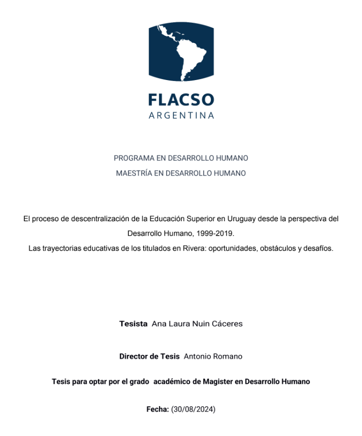 Nuin Cáceres, Ana Laura (2024). El proceso de descentralización de la Educación Superior en Uruguay desde la perspectiva del Desarrollo Humano, 1999-2019: las trayectorias educativas de los titulados en Rivera: oportunidades, obstáculos y desafíos. Tesis de Maestría. FLACSO. Sede Académica Argentina, Buenos Aires.