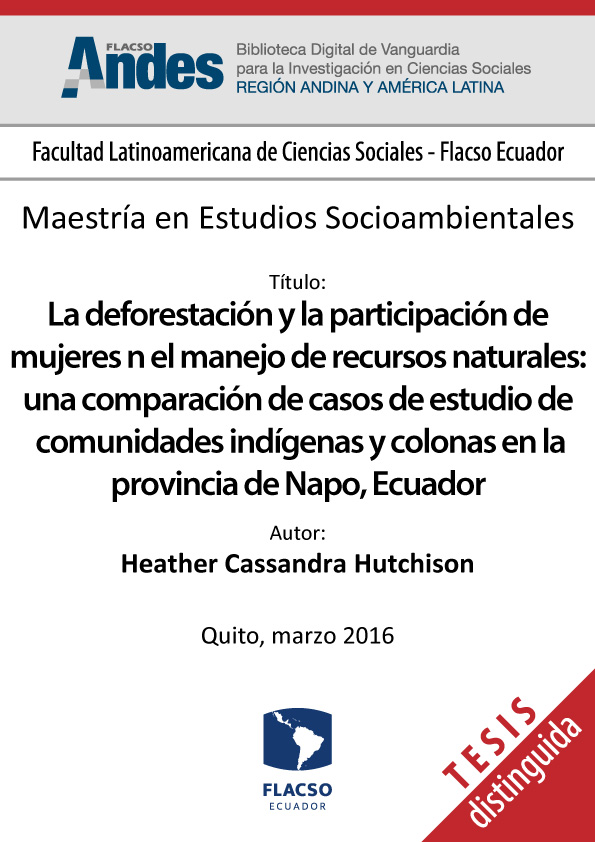 Hutchison, Heather Cassandra. 2016. La deforestación y la participación de mujeres en el manejo de recursos naturales: una comparación de casos de estudio de comunidades indígenas y colonas en la provincia de Napo, Ecuador o Deforestation and Female Participation in Natural Resource Management: Comparing Case Studies in Indigenous and Colonist Communities in the Province Of Napo, Ecuador. Tesis de maestría, Flacso Ecuador.
