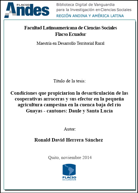Herrera Sánchez, Ronald David. 2014. Condiciones que propiciarion la desarticulación de las cooperativas arroceras y sus efectos en la pequeña agricultura campesina en la cuenca baja del río Guayas: Daule y Santa Lucía. Tesis de maestría, Flacso Ecuador.