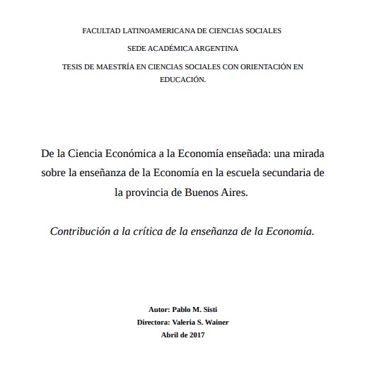 Sisti, Pablo Marcelo (2017). De la ciencia económica a la economía enseñada : una mirada sobre la enseñanza de la economía en la escuela secundaria de la provincia de Buenos Aires. Contribución a la crítica de la enseñanza de la economía. Tesis de Maestria. FLACSO. Sede Académica Argentina, Buenos Aires.