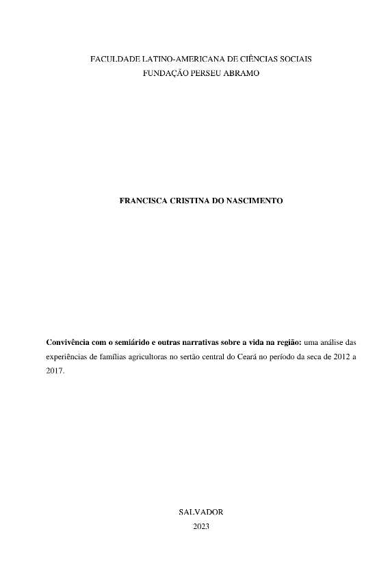 Cristina do Nascimento, Francisca. 2023. Convivência com o semiárido e outras narrativas sobre a vida na região: uma análise das experiências de famílias agricultoras no sertão central do Ceará no período da seca de 2012 a 2017. Tesis de maestría, Flacso Brasil.