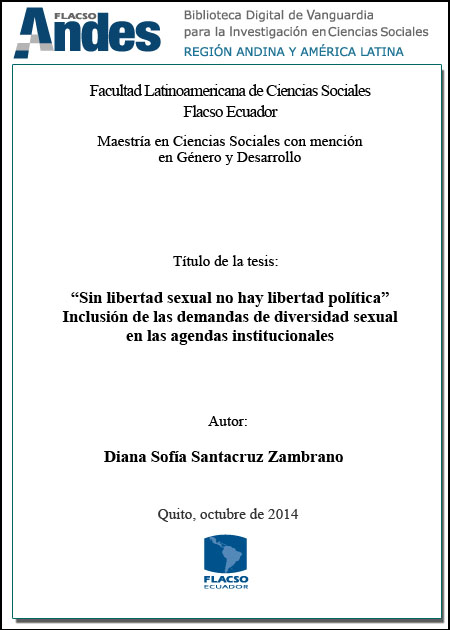 Santacruz Zambrano, Diana Sofía. 2014. Sin libertad sexual no hay libertad política: inclusión de las demandas de diversidad sexual en las agendas institucionales. Tesis de maestría, Flacso Ecuador.