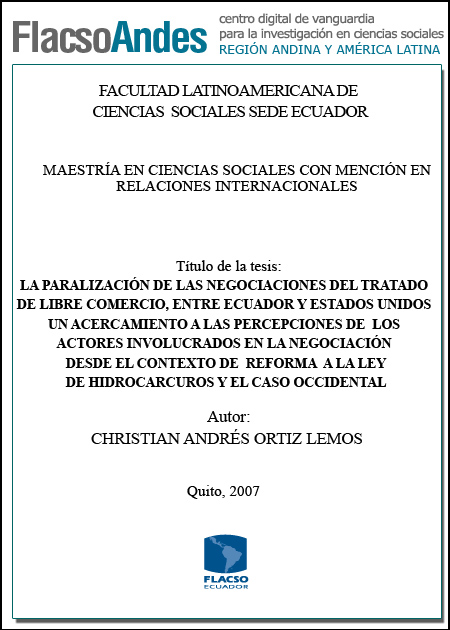 Ortiz Lemos, Christian Andrés (2007). La paralización de las negociaciones del Tratado de Libre Comercio, entre Ecuador y Estados Unidos. Un acercamiento a las percepciones de los actores involucrados en la negociación desde el contexto de Reforma a la ley de Hidrocarburos y el caso Occidental. Maestría en Ciencias Sociales con Mención en Relaciones Internacionales, Flacso Sede Ecuador. Quito. 211 p.