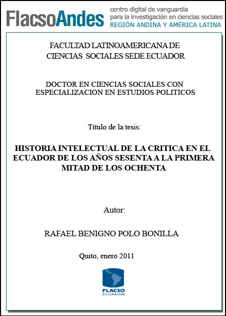 Polo Bonilla, Rafael Benigno (2011). Crítica y modernidad : historia intelectual de la crítica en el Ecuador de los años sesenta a la primera mitad de los ochenta. Doctorado en Ciencias Sociales con especialización en Estudios Políticos; FLACSO Sede Ecuador. Quito, 291 p.