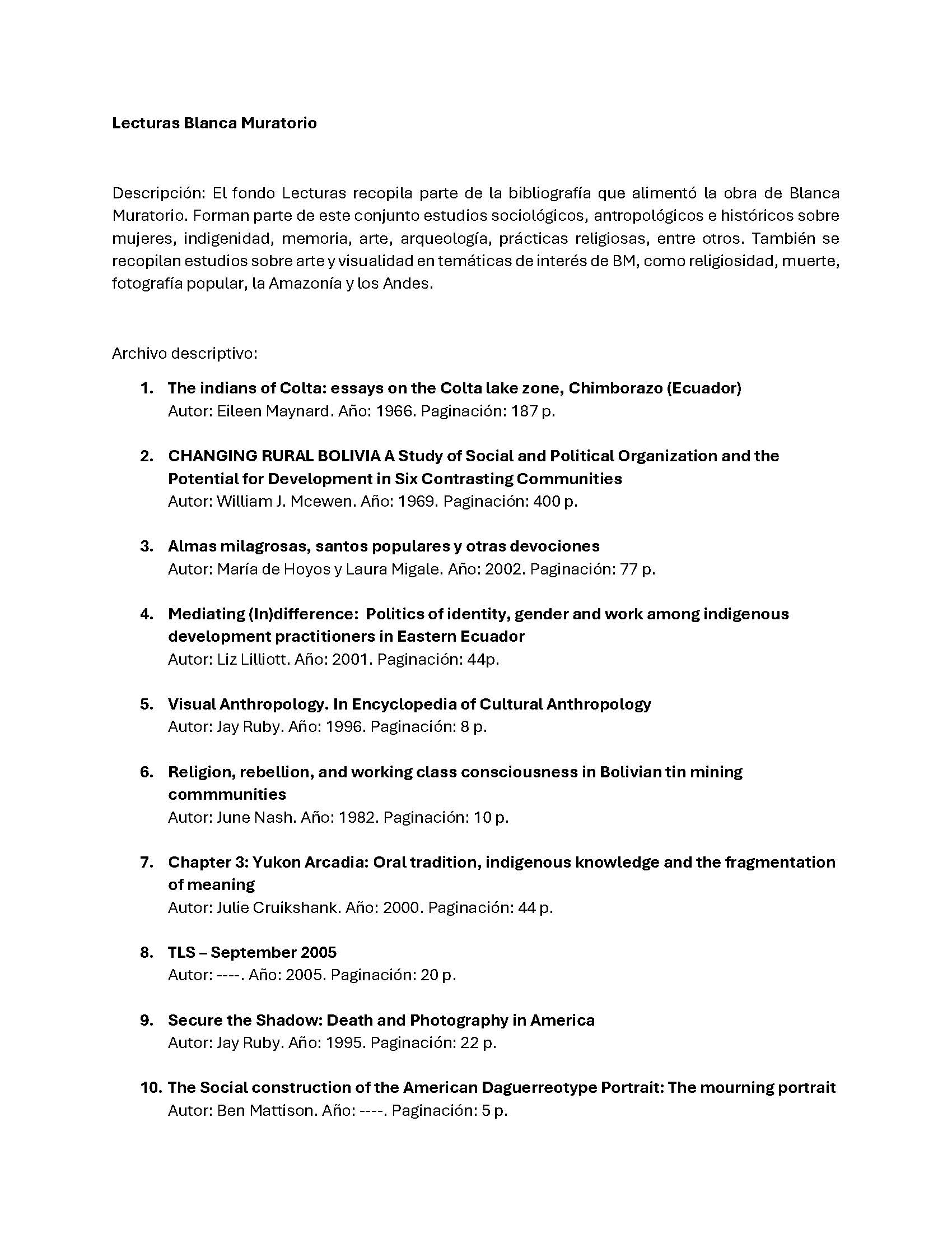 El fondo Lecturas recopila parte de la bibliografía que alimentó la obra de Blanca Muratorio. Forman parte de este conjunto estudios sociológicos, antropológicos e históricos sobre mujeres, indigenidad, memoria, arte, arqueología, prácticas religiosas, entre otros. También se recopilan estudios sobre arte y visualidad en temáticas de interés de BM, como religiosidad, muerte, fotografía popular, la Amazonía y los Andes. Documento descriptivo.