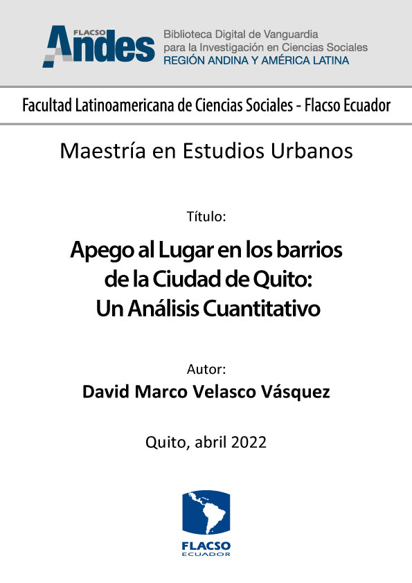 Velasco Vásquez, David Marco. 2022 Apego al Lugar en los barrios de la Ciudad de Quito: Un Análisis Cuantitativo. Tesis de maestría, Flacso Ecuador.