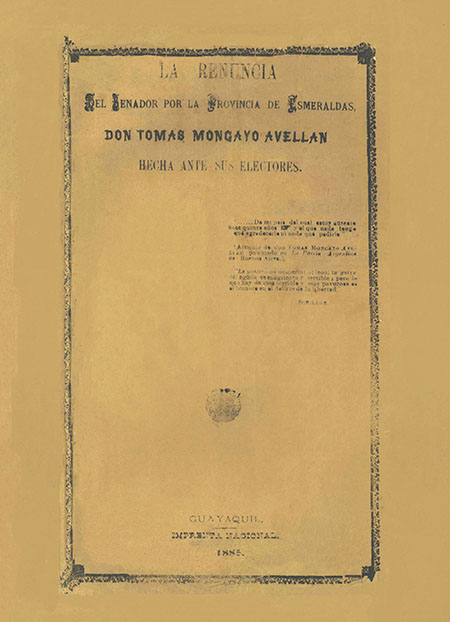 La renuncia del senador por la provincia Esmeraldas, Don Tomás Moncayo Avellán hecha ante sus electores (Publicación incompleta). 1885. Guayaquil, Ecuador : Imprenta Nacional.