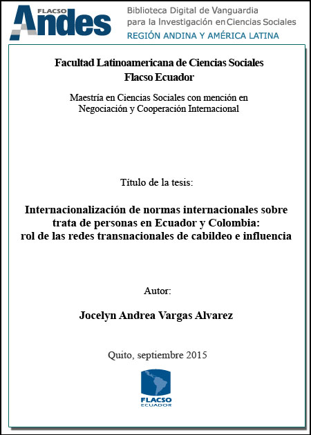 Vargas Alvarez, Jocelyn Andrea. 2015. Internacionalización de normas internacionales sobre trata de personas en Ecuador y Colombia: rol de las redes transnacionales de cabildeo e influencia. Tesis de maestría, Flacso Ecuador.