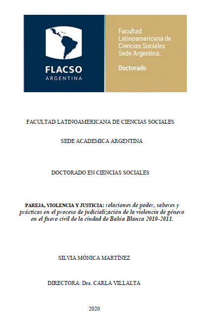 Martínez, Silvia Mónica. (2020). Pareja, violencia y justicia : relaciones de poder, saberes y prácticas en el proceso de judicialización de la violencia de género en el fuero civil de la ciudad de Bahía Blanca 2010-2011. Tesis de Doctorado. FLACSO. Sede Académica Argentina, Buenos Aires.