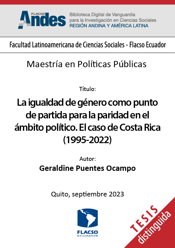 Puentes Ocampo, Geraldine. 2023. La igualdad de género como punto de partida para la paridad en el ámbito político. El caso de Costa Rica (1995-2022). Tesis de maestría, Flacso Ecuador.