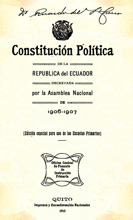 Asamblea Nacional del Ecuador. 1913. Constitución Política de la República del Ecuador : decretada por la Asamblea Nacional de 1906-1907. Quito, Ecuador : Imprenta y Encuadernación Nacionales.