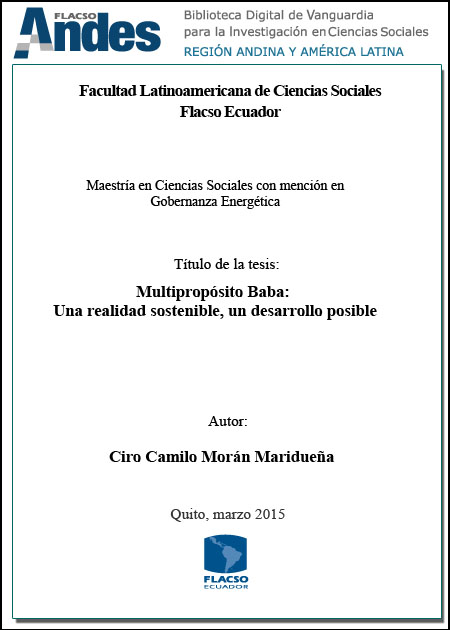 Morán Maridueña, Ciro Camilo. 2015. Multiproprósito Baba: una realidad sostenible, un desarrollo posible. Tesis de maestría, Flacso Ecuador.