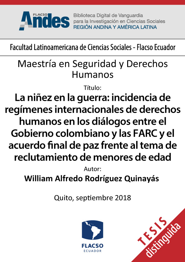 Rodríguez Quinayás, William Alfredo. 2018. La niñez en la guerra: incidencia de regímenes internacionales de derechos humanos en los diálogos entre el Gobierno colombiano y las FARC y el acuerdo final de paz frente al tema de reclutamiento de menores de edad. Tesis de maestría, Flacso Ecuador.