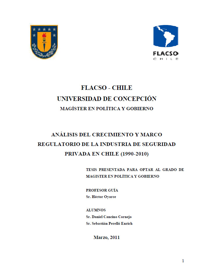 Cancino Cornejo, Daniel y Sebastián Perello Enrich. 2011. Análisis del crecimiento y marco regulatorio de la industria de seguridad privada en Chile (1990-2010). Tesis de Maestría, FLACSO Chile y Universidad de Concepción.