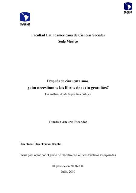 Anzures Escandón, Tonatiuh (2010). Después de cincuenta años, ¿aún necesitamos los libros de texto gratuitos? : un análisis desde la política pública. Maestría en Políticas Públicas Comparadas; FLACSO México. México. 104 h.
