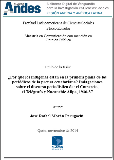Morán Perugachi, José Rafael. 2014. ¿Por qué los indígenas están en la primera plana de los periódicos de la prensa ecuatoriana? Indagaciones sobre el discurso periodístico de: el Comercio, el Telégrafo y Ñucanchic Allpa, 1930-37. Tesis de maestría, Flacso Ecuador.