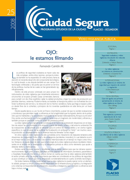 Ciudad segura. FLACSO sede Ecuador. Programa de Estudios de la Ciudad. Quito, (n.25, enero 2008): 12 p.