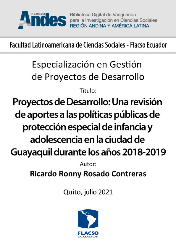 Rosado Contreras, Ricardo Ronny. 2021. Proyectos de Desarrollo: Una revisión de aportes a las políticas públicas de protección especial de infancia y adolescencia en la ciudad de Guayaquil durante los años 2018-2019. Tesina de especialización, Flacso Ecuador.