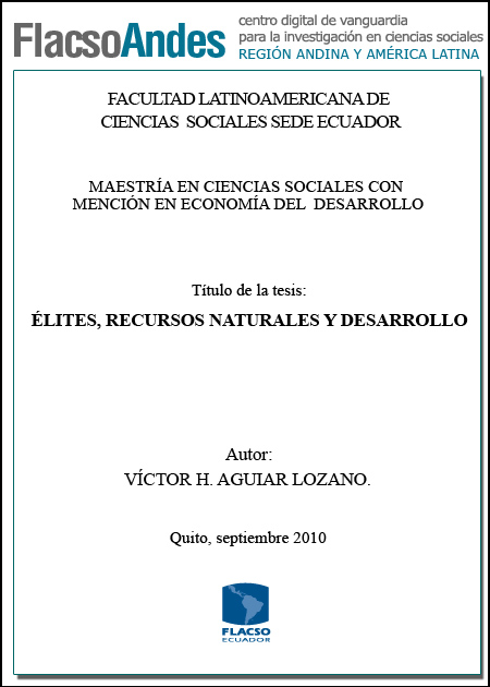 Aguiar Lozano, Víctor H. (2010). Élites, recursos naturales y desarrollo. Maestría en Ciencias Sociales con mención en Economía del Desarrollo; FLACSO - Sede Ecuador. Quito. 89 p.