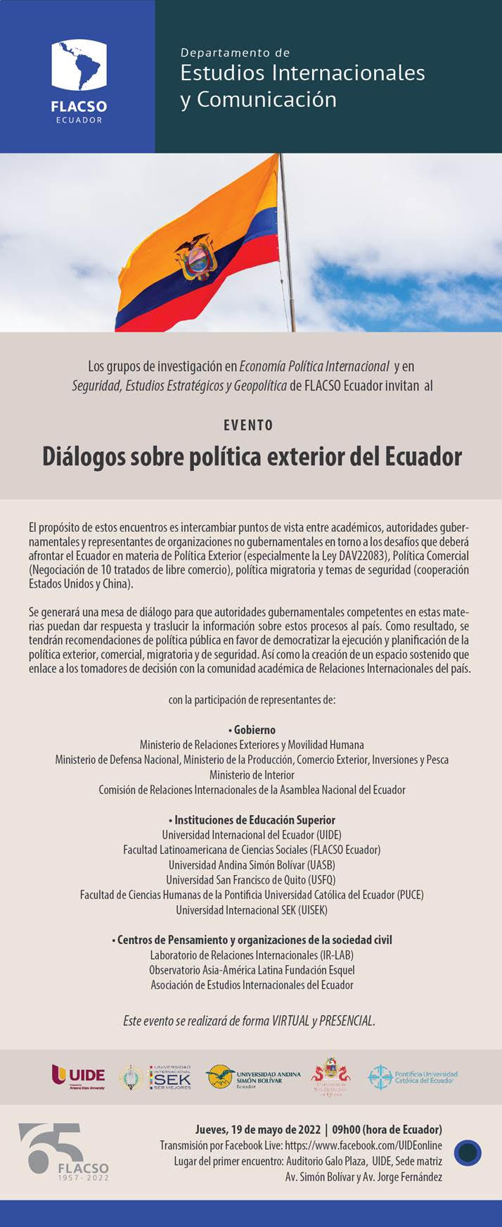 FLACSO Ecuador : Estudios Internacionales y Comunicación - Diálogos sobre política exterior del Ecuador, 19 de mayo de 2022 - 09:00 - 10:30 - FLACSO Ecuador, Quito. Con la invitación de los grupos de investigación en Economía Política Internacional y en Seguridad, Estudios Estratégicos y Geopolítica de FLACSO Ecuador.