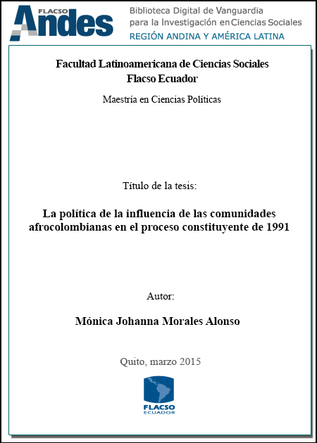 Morales Alonso, Mónica Johanna. 2015. La política de la influencia de las comunidades afrocolombianas en el proceso constituyente de 1991. Tesis de maestría, Flacso Ecuador.