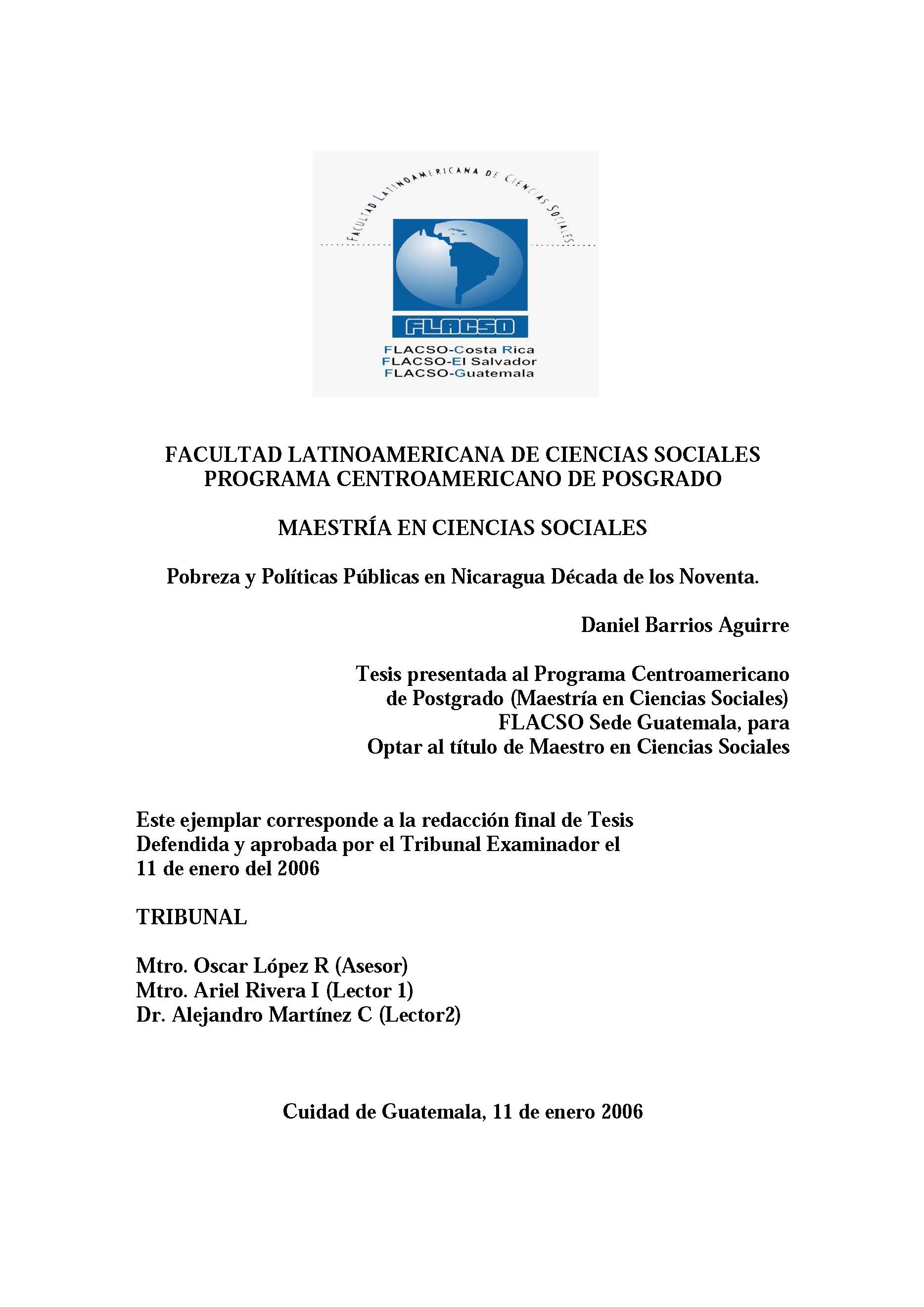 Barrios Aguirre, Daniel (2006). Pobreza y políticas públicas en Nicaragua década de los noventa. Maestría en Ciencias Sociales, FLACSO Programa Centroamericano de Postgrado. Guatemala. 168 p.