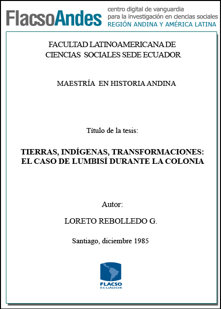 Rebolledo G. Loreto (1986). Tierras, indígenas, transformaciones: el caso de Lumbisí durante la colonia. Maestría en Historia Andina; FLACSO sede Ecuador. Santiago de Chile. 291 p.