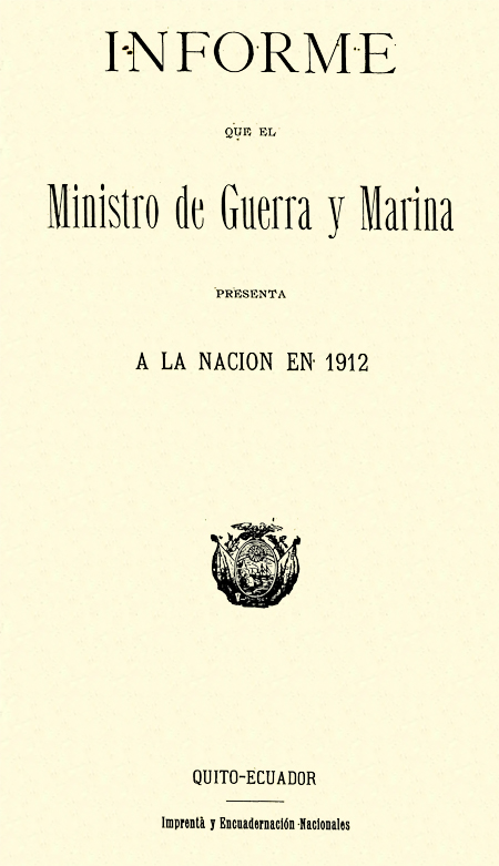 Navarro, Juan Francisco. 1912. Informe que el ministro de guerra y marina presenta a la nación en 1912. Quito, Ecuador : Imprenta y Encuadernación Nacionales.