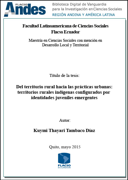 Tambaco Díaz, Kuymi Thayari. 2015. Del territorio rural hacia las prácticas urbanas: territorios rurales indígenas configurados por identidades juveniles emergentes. Tesis de maestría, Flacso Ecuador.